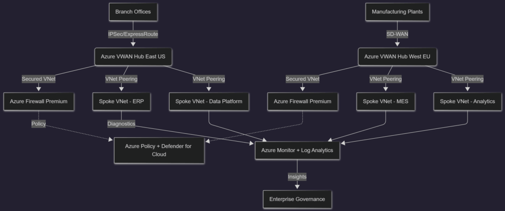 Azure Virtual WAN is Microsoft’s cloud-native backbone for unifying hubs, spokes, security services, and hybrid connectivity. An enterprise fabric layers governance, segmentation, and observability on top, using services such as Azure Firewall, Route Tables, Network Virtual Appliances (NVAs), ExpressRoute gateways, Azure Private DNS, and Azure Monitor. The blueprint is opinionated: it defines how traffic flows, which policies enforce segmentation, where packet inspection happens, and how resiliency is maintained across Azure regions.