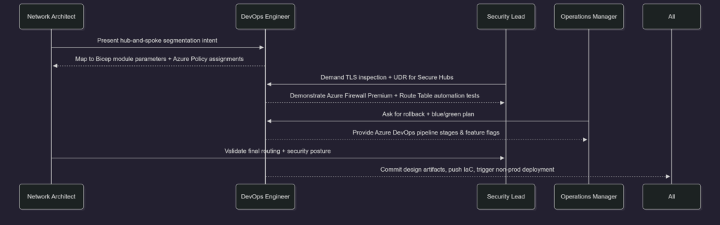 When an enterprise convenes an Azure networking design session, the agenda typically spans IP allocation, segmentation strategy, traffic inspection points, high availability, routing intent, and operational guardrails. Without a DevOps voice, the session risks delivering diagrams that cannot be codified or tested. The DevOps engineer keeps the conversation anchored around automation contracts:
